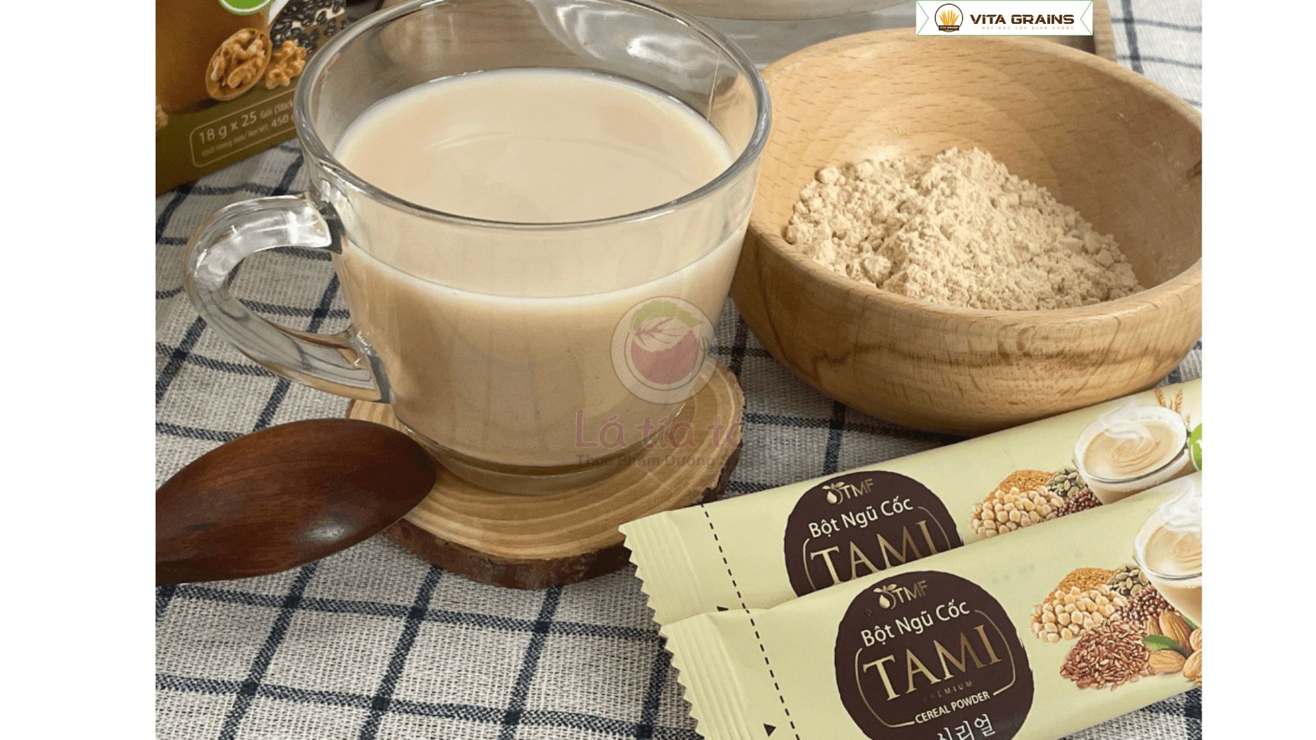 Cho 3–4 muỗng bột ngũ cốc vào ly hoặc bát.