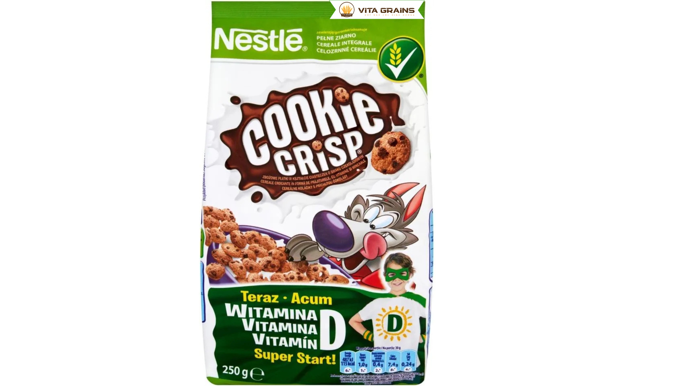 Thành phần | Ngũ cốc nguyên cám, socola, dầu, đường, vitamin, khoáng chất, có thể chứa sữa/hạt |